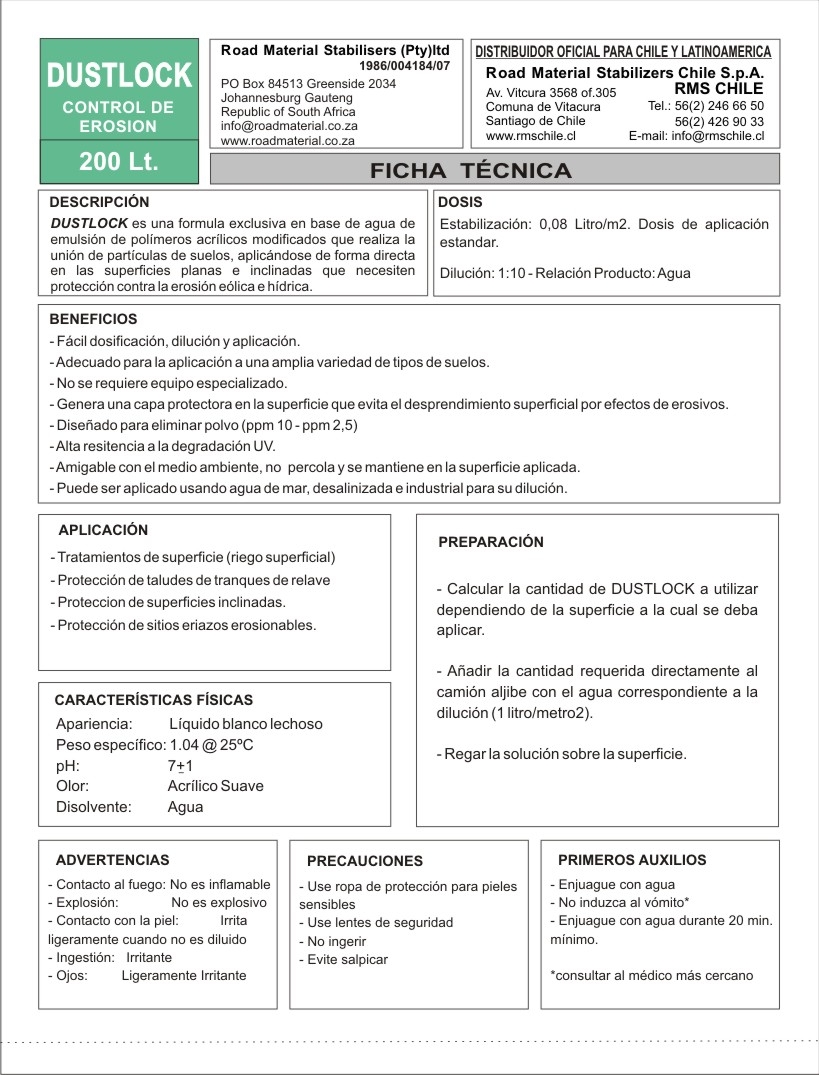 DustLock es un producto que elimina la emisión de polvo en superficies expuestas a agentes de erosión. Éste es desarrollado en base a una fórmula de polímeros acrílicos modificados que realizan la unión de partículas de los suelos.